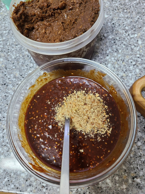 견과류 가루가 쌈장의 짬맛을 잘 조절해줍니다. 견과류가루가 좀 많은데? 정도 되어도 좋습니다.