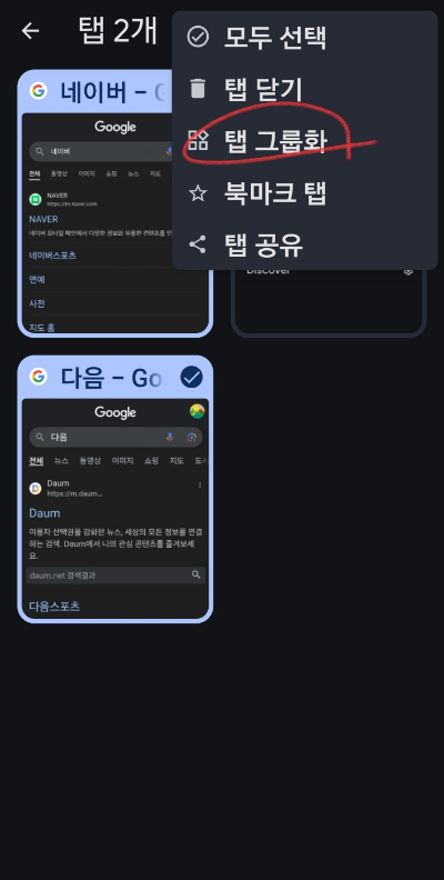 다시 탭 전환 메뉴 (⋮)를 클릭하고 "탭 그룹화"를 선택하면 그룹화 됩니다.