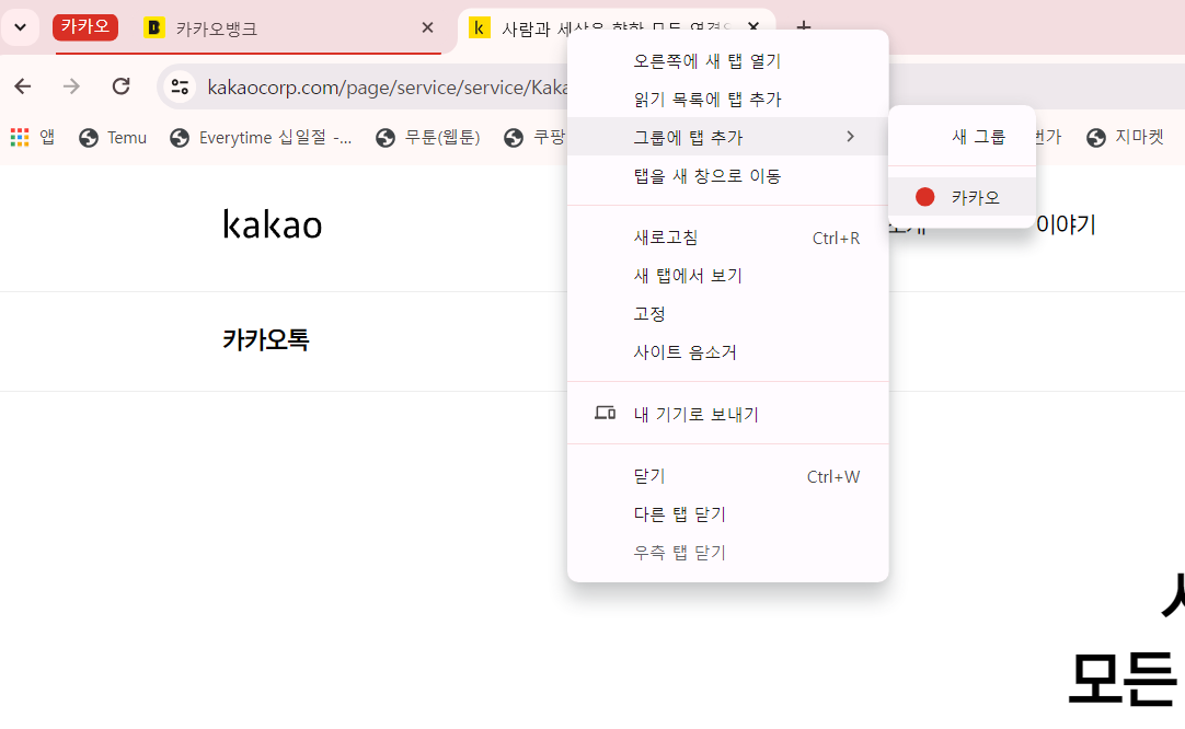 1.탭 위에 마우스를 대고 오른쪽 버튼 클릭 후 "새 그룹에 탭 추가" 선택