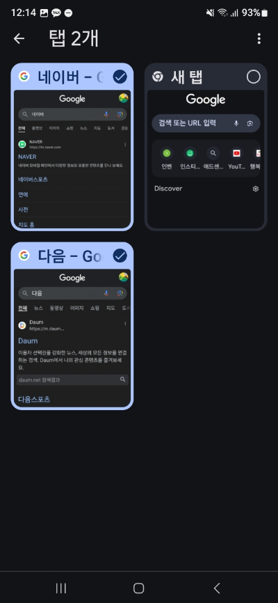 탭 전환 메뉴 (⋮)를 클릭하고 "탭 선택"을 선택하여 그룹할 탭을 선택한 뒤